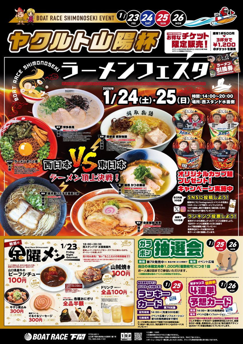 ボートレース下関ラーメンフェスタ 西日本VS東日本 投稿日 2026年2月7日 著者 アールシステム グルメイベント/活用事例 カテゴリー キッチンカー 使用車両:ベンツちょい長2号、ベンツちょい長3号、ベンツちょい長4号、ベンツ6号、ベンツ7号 https://www.ramenbrs.com 会場:下関ボートレース場 西スタンド南側 日時:2026年1月24日(土)25日(日)